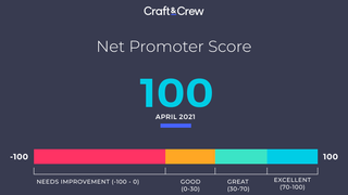 Net Promoter Score (NPS) is tracked using the following calculation based on the question, "Using a scale of 0-10, how likely are you to recommend Craft&Crew to a friend or colleague?"