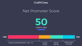Net Promoter Score (NPS) is tracked using the following calculation based on the question, "Using a scale of 0-10, how likely are you to recommend Craft&Crew to a friend or colleague?"